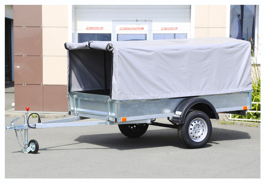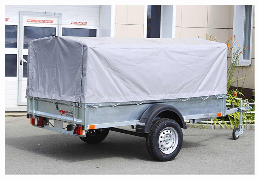 Тент и дуги. Для защиты груза от атмосферных осадков и дорожной грязи на прицеп рекомендуется установить комплект дуг и тент. Два вида тентов разной высоты: 0,25 и 0,75 метра от верхней кромки борта. Высокий тент имеет передний и задний клапан на молнии и липучке (защита замка от грязи). Для удобного доступа внутрь кузова, клапан сворачивается и фиксируется сверху липкой лентой.